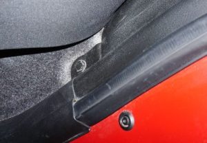 Das Bild links oben zeigt eine Schnellmotorwäsche. Löschpulverrückstände wurden nur teilweise entfernt. Unten an der Windschutzscheibe wurde ein Teil der Gummileiste mit einem Sonderreinigungsmittel gereinigt. Die Gummileiste ist wieder schwarz. Rechts davon ist die Gummileiste noch weiß vom Löschpulver.